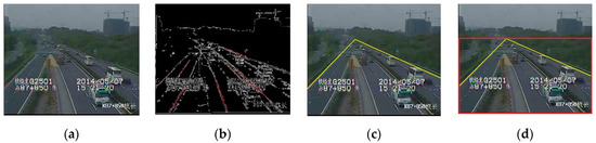 Figure 5. Lane space separation: (a) original Image; (b) lane candidates; (c) driveway boundary; (d) result for lane separation.- Step 1: Obtain the edge information in the video through edge detection.
