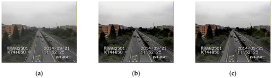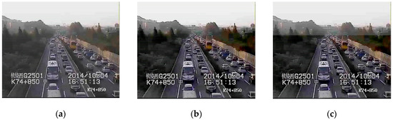 In traffic video dehazing, the cameras are divided into different regions according to their locations, and one camera in a region is set as the calibration camera. The images from the calibration camera are used to calculate the initial transmission value, which is also applied to other cameras in the same region. Therefore, we can avoid repeatedly calculating the values of , , and for other cameras, thus improving the efficiency of haze removal. The results of haze removal with the initial transmission value obtained by calibration cameras is shown in Figure 9b, and the result directly using the initial transmission value obtained by the image itself is shown in Figure 9c. It is obvious that the results are very similar in these two ways. It takes 0.033 s to calculate the initial transmission value, which can be saved by using that of the calibration camera.
