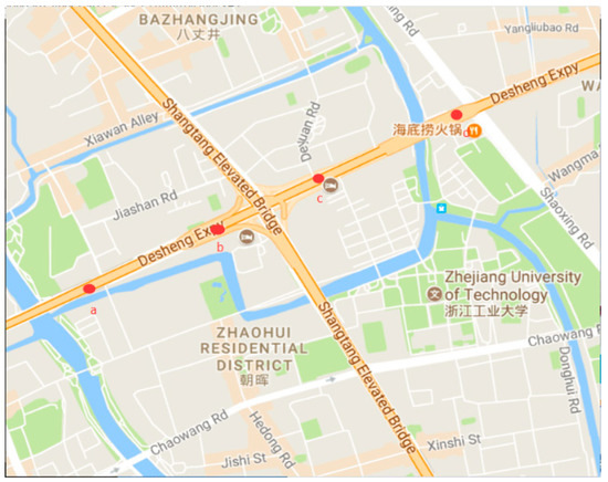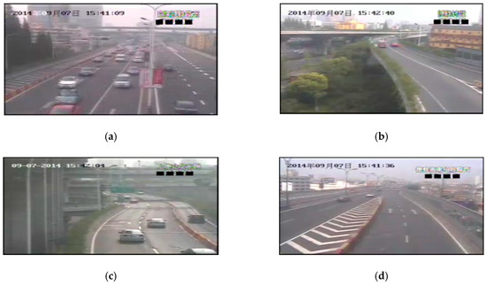 Figure 7 shows the images captured by four surveillance videos of DE-elevated freeways in Hangzhou City at the same time. The locations of these cameras are shown in Figure 8, where the distance between the cameras is about 500 to 600 m. Table 3 shows the initial transmission values of these four videos. The haziness flag values T calculated from each video are shown in the first column of Table 3. We obtain relatively proper initial transmission correction value by using the method proposed in Section 3, and then determine the initial transmission value . According to the results, these initial transmission values are very numerically similar, thus there may be no obvious influence on the restored images.