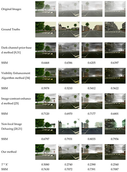 Figure 11 shows four images from Foggy Road Image Database (FRIDA) [33] and restored these images using the dark-channel-prior-based method [9,31], the visibility enhancement algorithm [34], the image-contrast-enhanced method [25], the non-local image dehazing method [20,21], and our method. The SSIM values in Figure 7 are the average values of three channels of RGB. In FRIDA [33], each image without fog is associated with some hazy images, and different kinds of fog are added in each image—uniform fog, heterogeneous fog, cloudy fog, and cloudy heterogeneous fog. According to the experimental results, the dark-channel-prior-based method does not have satisfactory results for haze removal in heterogeneous fog and cloudy heterogeneous fog, while the image-contrast-enhanced method and our method achieves more satisfactory results for these two cases. In addition, our method obtains the highest for the restored images compared to the first three methods, thus the restored images using our method are more similar to ground truth. As to the results of non-local image dehazing method [20,21], the for some restored images may be higher than those of our method. However, the non-local image dehazing method takes longer processing time, as shown in Table 4. Table 4 provides the overall processing times of these methods. Our method is faster than the dark-channel-prior-based method [9,31] and visibility enhancement algorithm [34]. However, our method takes more time than the image-contrast-enhanced method [25] because it spends some time in calculating the image haziness flag value and the initial transmission correction value. However, the results for haze removal using the proposed method are better than the results of the image-contrast-enhanced method. Although the non-local image dehazing method can get more satisfactory restored images, it is too slow to be used in real-time scenarios. In addition, it usually needs to manually set the parameters to different scenes, which is not suitable for real-time traffic video processing. Further still, we can spread this part of the computation time over all frames in video dehazing and reach a faster dehazing speed through the fusion of spatial and temporal information.
