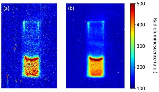 We imaged the radioluminescence by placing a sample on a holder close to the quartz window and an EMCCD camera (Andor iXon3 897) on the other side of the window. Sample holder and camera objective were kept at a constant distance of about throughout all experiments. The camera sensor was internally cooled down to −80 °C to reduce thermal noise. We placed the sample and the holder insight a light-tight PVC tube and wrapped the camera in black fabric to further improve the ambient light shielding. The imaging lens was a UV-objective (Universe Kogaku, UV1228CM) with a focal length of and a light collection efficiency of . A schematic illustration of the arrangement is shown in Figure 1.