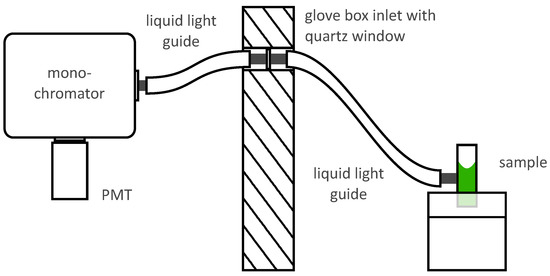The radioluminescence spectrum was measured by transporting light with a system of liquid light guides outside the glove box, where it was analyzed. A schematic illustration of the arrangement is presented in Figure 3. The sample was placed on a height-adjustable pedestal inside the glovebox. The liquid light guide (Lumatec GmbH, Series 300, 8mm core diameter) was installed next to the pedestal to collect the light emanating from the sample. The fiber was put as close as possible to the sample to eliminate the need for collimating optics. When the liquid sample was spectrally analyzed, the fiber was installed as close as possible to the sample holder to make sure that only radioluminescence from the bulk of the liquid reaches the detector. From there the light was guided to a thick quartz window in the ceiling of the glove box. Another liquid light guide at the other side of the window then picked up the light and further transported it to a motorized monochromator (Horiba Scientific Inc., iHR 550), where it was spectrally dispersed. Light of only one selected wavelength leaves the monochromator at a time. The monochromator was operated with a UV sensitive grating (model 51050, , blaze) and an entrance slit width of , resulting in a spectral resolution of about . The light passing the monochromator was measured with a low-noise photon counting PMT (Perkin Elmer GmbH, MP-1982, DC) and read out via computer.