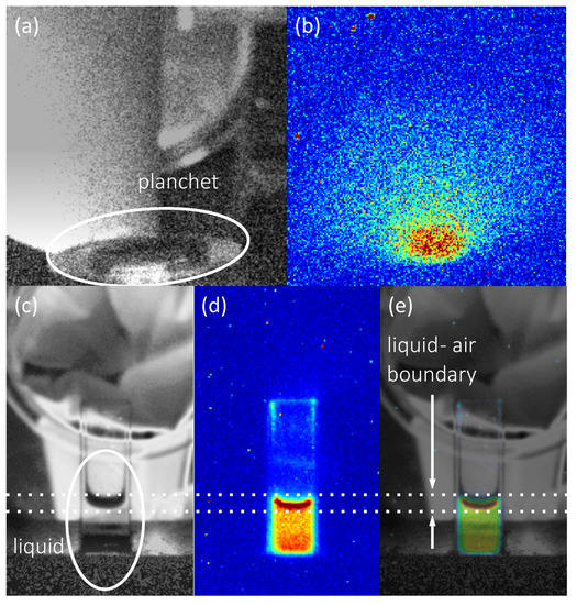 Radioluminescence of Am-241 which has been dissolved in was imaged with the EMCCD camera in darkness. In addition, we took a photograph image under normal lighting conditions for a reference. We repeated the procedure for the Pu-239 solid sample planchet, where we expected radioluminescence of air to occur above it. That served as an intensity calibration regarding to previously published results [26]. The recorded images are shown in Figure 4.