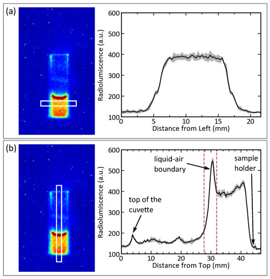 Vertical and horizontal cross sections of the radioluminescence image of the cuvette are shown in Figure 5 for detailed analysis of the intensity distribution. In the horizontal cross section in Figure 5a it can be seen that the radioluminescence is evenly distributed throughout the liquid. We notice that the glass walls have no influence on the light production. In the vertical cross section in Figure 5b the differences in radioluminescence intensity as a function of height become clearly visible. The rightmost peak corresponds to the slightly increased intensity seen at the point where the cuvette is submerged in the holder. The maximum in the vertical cross section shows the increased light production at the surface of the liquid. Dotted lines indicate the position where the interface of the liquid-air boundary faces the camera. They correspond to the same dotted lines shown in Figure 4. Between these two peaks, the radioluminescence intensity is notably evenly distributed.