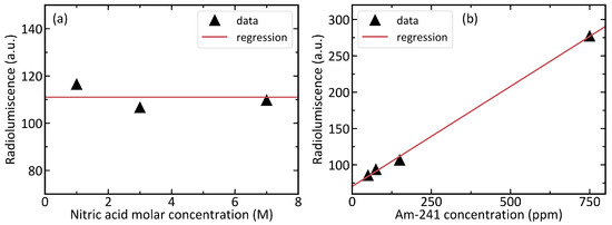 Dependence of the measured radioluminescence intensity on the nitric acid concentration and the americium concentration. The pixel values displayed as radioluminescence have been corrected for the image background. (a) Change of the radioluminescence with a varying nitric acid concentration. A constant has been fitted to the data. (b) Change of the radioluminescence with varying Am-241 concentration. A linear function has been fitted to the data.
