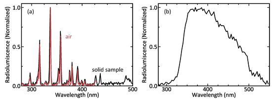 The normalized spectrum of the light produced by the solid sample in Figure 7a shows the lines [16], which is commonly associated with radioluminescence in air. This is congruent with other works investigating air radioluminescence [1,7,29]. To demonstrate the validity of the measurement, the spectrum has been superimposed with the normalized spectrum of radioluminescence in air which has been measured at a higher spectral resolution [19]. Contrary to the radioluminescence of air, the spectrum of aqueous solution under ionizing radiation has not been fully resolved earlier apart from a rough estimation using several long-pass filters [22]. Thus, the spectrum of the radioluminescence of aqueous solution in Figure 7b is, to the best of our knowledge, reported here for the first time. The radioluminescence is weak and spectrally broad, which makes it difficult to record. The spectrum shows a broad maximum between and with a gradual decrease until at the longer wavelength side. On the other hand, the spectrum exhibits a pronounced decrease at shorter wavelength side reaching down to the background level already at . This steep decreasing slope at shorter wavelength side contrasts with the earlier study done with long-pass filters [22], where they estimated a continuous increase towards the shorter wavelengths resembling the spectral shape of the Cerenkov light. Cerenkov light has a spectrum that is proportional to , where is the wavelength of the emitted light [30]. The data in Figure 7 (b) clearly shows this is not the case with the radioluminescence of aqueous solutions, as there is the steep decrease at short wavelength side of the spectrum. Furthermore, alpha particles are not capable of producing Cerenkov light directly or through secondary mechanisms [31] and therefore we conclude that the measured radioluminescence must have an origin other than Cerenkov radiation. The spectral response of the measurement system is compensated in the results and the air radioluminescence spectrum with the same setup demonstrates the correct spectral shape down to , thus validating the spectral response of the measurements. The only optical difference between the measurement arrangements is the quartz cuvette, which has a flat spectral transmittance over the whole measurement range and therefore no effect on the results. The steep decrease at the short wavelength side of the spectrum makes it uncharacteristic for broadband emissions such as Cerenkov light and bremsstrahlung emission. We rather speculate that some of the radiolysis products [32] of water, such as , or , might be responsible for the recorded luminescence of water under the ionizing radiation.