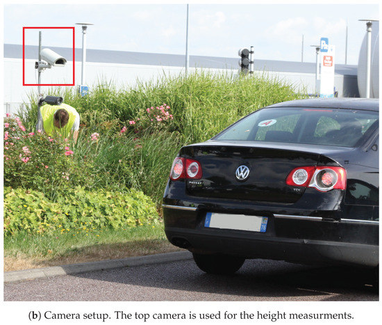 Measuring the height from the location of 3D points in the scene requires to obtain the extrinsic calibration, i.e., the location of the camera with respect to the ground plane and the traffic direction. As mentioned in [8], calibration patterns do not naturally exist in traffic scenes. Consequently, there is a growing interest in automatic calibration from CCTV cameras. Reference [9] relies on vanishing points to find out the camera orientation with respect to the ground plane. The traffic’s main direction and gradients from the vehicles are used to find the vanishing points.