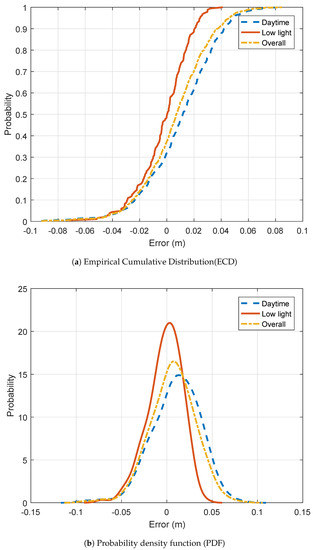 Figure 6b shows the distribution of the relative error. Experiments with low light lead to errors lower than 3%. 60% of the nighttime samples have errors lower than 1 cm (0.39 in). The daytime dataset results in errors lower than 5%. 60% of the samples have errors less than 1.5 cm (0.59 in). The shape of both daytime and low light ECDs looks similar except at the left-hand side of the distribution where the daytime curve first flatten and then increase again.