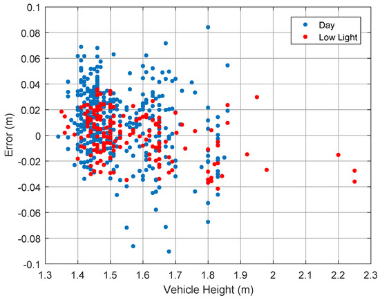 In Figure 7, we investigate the correlation of the absolute error and the true vehicle height. It can be seen that some correlation exists between the vehicle height and the signed error. The absolute error is negatively correlated with the vehicle height. In other words, the height is slightly overestimated for small vehicles and underestimated for large vehicles. The correlation is less significant for daytime samples.