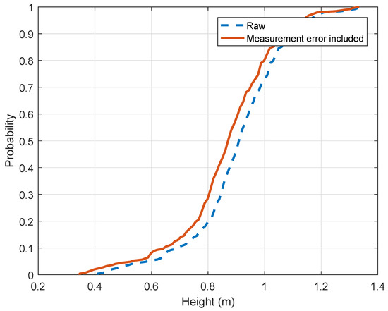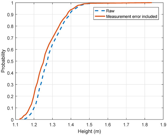 Height of driver’s height statistics were measured from the daytime dataset (c.f. Figure 1d and Figure 5a). They are based on 400 samples. Figure 8 details the heights extracted from our dataset. It displays the raw CDF as well as the corrected CDF given the measurement error obtained from the previous experiments. After correction, the median value is equal to 1.26 m (4.13 ft) while the mean value is 1.27 m (4.16 ft). The eye distribution is slightly biased toward the right. 1.18 m (3.87 ft) corresponds to the 10th percentile and 1.38 m (4.52 ft) corresponds to the 90th percentile. The 5th and 95th percentiles are respectively equal to 1.16 m (3.8 ft) and 1.42 m (4.65 ft). Values are larger than figures found in the literature. The second percentile is equal to 1.14 m in our study. The gap between the past and actual values is larger than the measurement uncertainty. Consequently, the drivers’ height standard should be updated. It might be explained by the increase of compact and large SUV shares in national automobile fleet from 2010s.