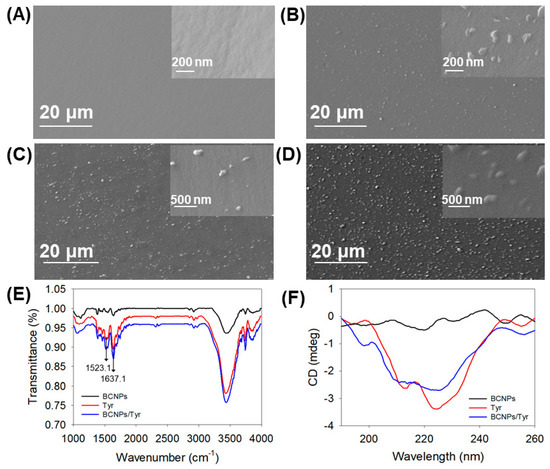 SEM images of (A) GCE, (B) BCNPs/GCE, (C) BCNPs/Tyr/GCE, (D) BCNPs/Tyr/Nafion/GCE. (E) FTIR spectra of BCNPs, Tyr and BCNPs/Tyr. (F) CD spectra of BCNPs, Tyr and BCNPs/Tyr.