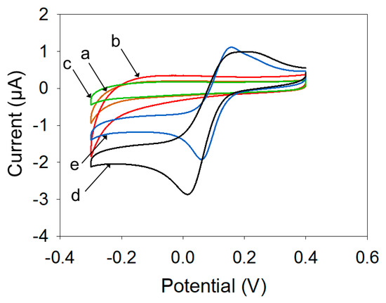 Cyclic voltammograms of the biosensor by using different electrodes (a–c) before and (d,e) after the addition of BPA (100 μM), (a) GCE, (b) BCNPs/Nafion/GCE, (c) BCNPs/Tyr/Nafion/GCE, (d) BCNPs/Tyr/Nafion/GCE, (e) Tyr/Nafion/GCE. Scan rate: 0.05 V s−1.