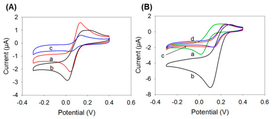 Cyclic voltammograms of the BCNPs/Tyr/Nafion/GCE biosensor in response to 100 μM BPA, (A) depending on various amounts of BCNP loading (a-c represent 0.25, 0.375 and 0.5 mg mL−1 of BCNP concentrations, respectively), and (B) depending on various amounts of Tyr loading (a–d represent 0.1, 0.5, 1.0 and 1.5 mg mL−1 of Tyr concentrations, respectively). Scan rate: 0.05 V s−1.