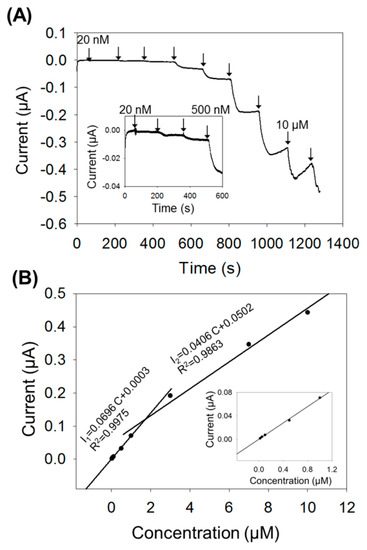 Recently, we demonstrated some attractive characteristics of biochar that are beneficial for biochar based electrochemical sensor development. These include that nanometer-sized biochar particles denoted as biochar nanoparticles (BCNPs) have the greater surface area vs. the conventional millimeter sized biochar particles [34] and that biochars prepared at high pyrolysis temperature have a great electrochemical catalytic property [35,36,37]. In this sense, an enzyme biosensor prepared by using such biochar nanoparticles with outstanding electrochemical catalytic properties and high surface area would have the potential to improve detection sensitivity.