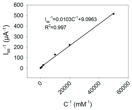The Michaelis–Menten constant (Km) is the substrate concentration at which the enzymatic reaction rate is half of the maximum reaction rate, and it is also one of the most important kinetic parameters. In electrochemistry, the equation for measuring the Michaelis constant is , where Iss is the response current after addition of a certain concentration of substrate, Imax is the maximum current when the substrate is saturated and C is the substrate concentration [47]. Kinetic parameter Km was evaluated by the Lineweaver–Burk plot using BPA as substrate (Figure 6). When calculated, the Km value was 1.13 μM, which was much smaller than the values reported in other literatures [48,49,50], indicating that the biosensor could maintain its good enzymatic activity, and also had a high affinity for BPA.