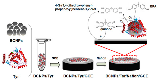 A glassy carbon electrode (GCE) with a 3 mm diameter (Shanghai Chenhua Instrument Co. Ltd., Shanghai, China) was polished with 0.5 µm alumina slurry, and cleaned with absorbent cotton to remove excess alumina slurry. After sonication for 4 min, it was washed with ultrapure water and methanol, and dried under a nitrogen gas. For the preparation of the BCNP enzyme biosensor, 0.5 mg mL−1 of tyrosinase was mixed with 0.375 mg mL−1 of BCNPs in the phosphate buffer solution (50 mM, pH 7.0). Then, the composite mixture (5.4 μL) of BCNPs and enzyme was cast onto the pristine GCE electrode, followed by adding 0.6 μL of Nafion (0.5 wt%) (Scheme 1). Then, it was dried under an ambient condition and denoted as BCNPs/Tyr/Nafion/GCE.