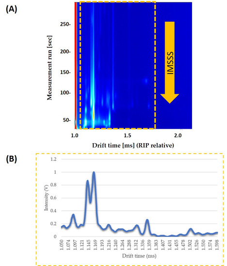 The ionized analytes are separated inside a drift tube under the influence of a constant electric field. The time spent by each ion to cross the drift tube is known as drift time and it is characteristic of each analyte, since it varies depending on the size and geometric shape of analytes [28,29,30,31]. Once the ions reach the detector, the number of ions is translated in voltage units (intensity signal).