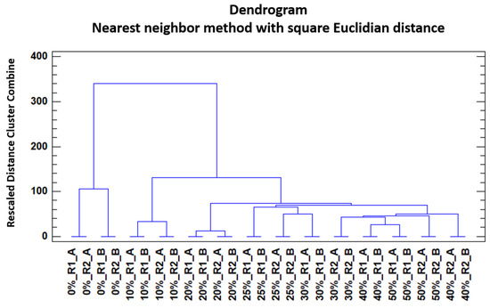 In order to study the trends of the honey samples to get grouped according to their level of adulteration by HFCS, a non-supervised method was selected. HCA and a Nearest neighbour method with square Euclidian distance was applied. For this analysis, the IMSSS of the two replicas from each of the 14 samples (two unadulterated honey and two samples of adulterated honey at each one of the different percentages) were analysed by HCA. The results were graphically represented in a dendrogram (Figure 4).