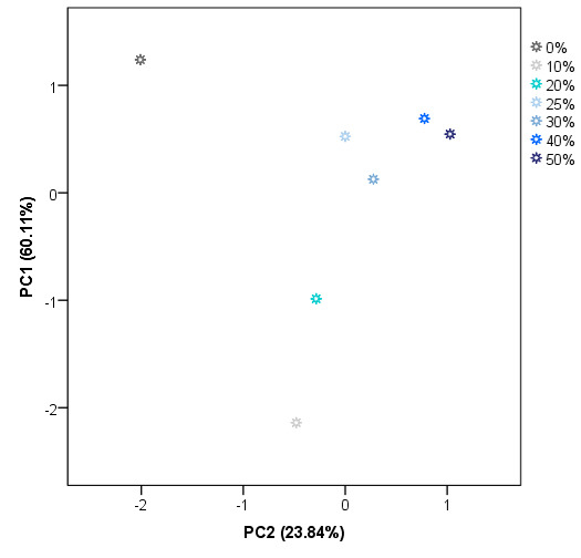 These results suggest that IMSSS differences are related to some of the compounds that can be found in adulterated honey and also to their percentage in the sample. However, a successful and complete classification of the samples was not achieved. Therefore, another non-supervised technique namely PCA was applied to the same data matrix D28X578. Principal components (PCs) with eigenvalues greater than 1 were extracted, obtaining a total of 8 PCs. PC1 accounts for 60.11% of the variance of the IMSSS data. The first two factors account for more than 83.95% of the total variance and the first three more than 96%. The score plot for group centroids according to the first two PCs is shown in Figure 5.