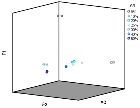 As PC1 and PC2 showed high loading values (higher than 0.8) for almost all of the drift times (data not shown), a specific region for the LDA was not selected for this analysis but the whole data matrix D28X578. All of the 28 IMSSS were subjected to LDA using a cross-validation and stepwise method. Six groups were established a priori according to their adulterant content percentage (0–50%); 100% discrimination was obtained for all the groups. Discriminant scores for all samples according to the first three discriminant functions (F1, F2 and F3) were represented in Figure 6. As it could be observed, F1 is the main responsible for the discrimination between unadulterated and adulterated honey samples. However, F2 and F3 are necessary for the discrimination between the different percentages of adulteration. Based on the LDA results, adulterated honey samples can be identified, and their percentage of adulteration can be discriminated based on their IMSSSs.