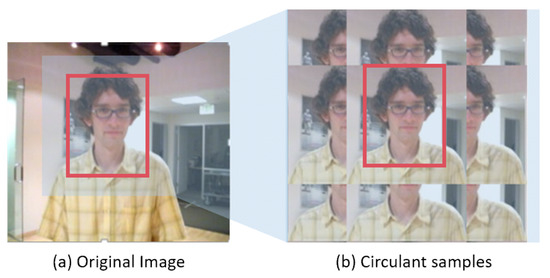The discriminative correlation filter tracker was firstly proposed by Bolme et al. [3]. The method takes the affine transformation of the target grayscale feature as the training sample, and trains the correlation filter that correlates the sample features with the ideal Gaussian response. The target in the next frame can be obtained at the response map peak. MOSSE achieves operation speeds of 600 fps. On this basis. Henriques et al. [26] proposed the Kernelized Correlation Filters (CSK) which takes the circulant shift of the region around the target as the training sample and thus mathematically solves the problem of dense sampling. Therefore, the correlation filter can be learnt by solving the least squares in frequency domain with fast Fourier transform (FFT), and achieves real-time computing speed. Based on this classical tracker, many improved methods have been proposed. As for target features [5,8,27,28,29,30,31], Henriques et al. [4] used multi-channel HOG features to replace grayscale features and introduced a kernel function. Danelljan et al. [7] used a color naming feature (CN) which is dimensionality reduced with PCA. For scale estimation [5,6,32,33], Danelljan et al. [5] used a 32-dimensional scale filter to estimate the scale of the target. However, these correlation filtering algorithms are inevitably affected by the boundary effect. Samples constructed by circulant matrix (see Figure 1), especially at the boundary which can’t represent real feature information. The filter learned from this limited circulant shifted image block is more likely to drift in the case of deformation and motion blur.