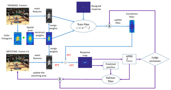 Main components of our tracking framework. The whole improved methods are represented by blue lines and purple lines. The blue lines denote the improving correlation filter with adaptive weights, which aims to enhance the target feature and suppress the background distractors. The purple lines denote the treatment to occlusion, which can prevent the target template from occlusion pollution and ensure that the target after occlusion can be redetected at the updated searching area.
