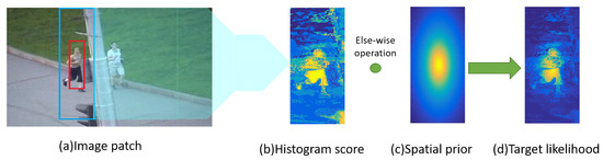 The input patch is shown as (a), where the foreground and background of the target are extracted from the red and blue bounding boxes, respectively. (b) shows histogram score which is obtained according to the color model in the search area and can reflect the differences between the target and background interference. Spatial prior at (c) indicates that the features at the center are more important than the features around. Combining the histogram score and spatial prior, the target likelihood can enhance the target features while suppressing the surrounding-distractors, which is shown as (d).
