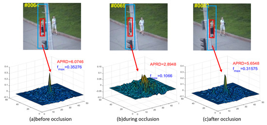 Using Jogging as an example (see Figure 4) the targets in Figure 4a,c are not occluded yet, so the response maps show one sharp peak, which indicates one definite object. Compared with which, the response map in Figure 4b, where the target suffers from occlusion, shows multiple peaks. Although the peak value does not decrease sharply, the average response difference caused by multiple peaks increases remarkably, and thus APRD decreases significantly.