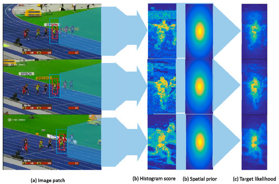 Histogram score is obtained from Equation (2) i.e., , the size of which is . As Figure 3 shows, can enhance the feature information which is similar to the target in the searching area. To prevent the potential influence of the enhanced background-distractor, a spatial-prior function of size is defined as follow: