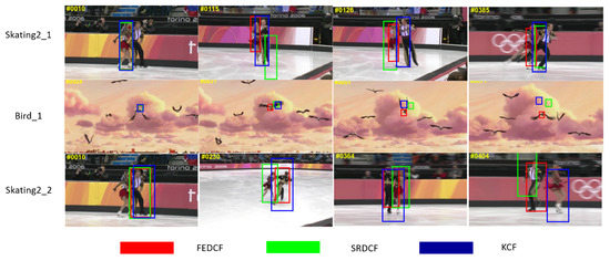 The screenshots from Skating_1, Bird 1 and Skating_2, where the targets are the female skater, bird at the screen center and the male skater, respectively. The target results of FEDCF, SRDCF and KCF are respectively highlighted with red, green and blue bounding boxes.