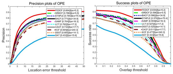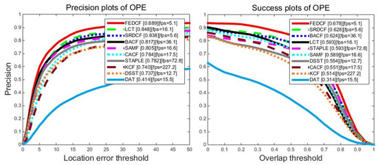 - The proposed FEDCF was compared with the current state-of-the-art trackers on some standard datasets (OTB2013 (Figures S1–S24) [19] and OTB2015 (Figures S25–S48) [20]). The proposed algorithm runs at approximate 5 fps and achieves the top rank in term of accuracy and robustness.