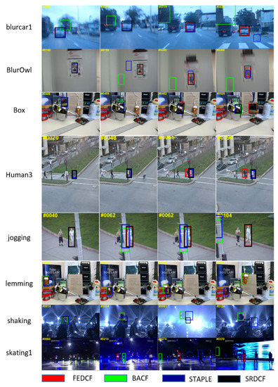 In order to intuitively show the compared performances of the trackers on challenging video sequences in the OTB2015 dataset, we show screenshots of eight challenging videos from OTB2015 (see Figure 10). Because of space limitations, we only compare our FEDCF with the top four trackers: BACF, SRDCF and Staple, and their estimated bounding boxes are respectively shown as the red, green, black and blue rectangular boxes. The sequences in first two row (Blurcar1, BlurOwl) mainly suffer from serious motion blur. In the Blurcar1 image, BACF and STAPLE lost the target at the beginning and drift to the background, and only our FEDCF and SRDCF finish the tracking mission with great ability by utilizing HOG features. The target in BlurOwl undergoes even more serious motion blur where the target feature is kind of similar to the background, and BACF still loses the target at the start. As we can see, STAPLE hardly catches the target by matching with the color histogram. As for SRDCF, which only relies on texture features, the estimation of scale is not accurate enough, however, our FEDCF can keep up with the target accurately. The sequences of the next four rows (Box, Human3, Jogging, Lemming) can mainly be considered occlusion scenes. When the target in Jogging is occluded, only our FEDCF and SRDCF redetect the target successfully after its reappearance. The success of SRDCF can be attributed to its larger searching area which is four times the target size and that the moving distance of the target is not too long in the plane because of the moving camera. Although the search area of our FEDCF is smaller (2.5 times the target area), it still performs well. In the Human3 scene where the camera is fixed, not only BACF and STAPLE, but also SRDCF lost target the finally. Our proposed FEDCF is the only tracker which doesn’t lose the target. This is because FEDCF utilizes the Kalman filter to update the search area which ensures that the target will still be located at the center of the search area where the features are enhanced after occlusion. The target in Lemming undergoes a brief occlusion, which only FEDCF and BACF can tackle well. The scene of Box is similar to Lemming, however the target suffers from occlusion for over 10 frames. Only FEDCF catches the target successfully all the way, which is due to the fact that FEDCF uses APRD to stop updating the template immediately when the target is occluded and effectively prevents the template from being corrupted. The sequences of the last two rows (Shaking, Skating _1) mainly suffer from illumination variation and deformation. In the Shaking scene, SRDCF and STALE lost the target after drastic lighting changes, while our FEDCF and BACF show great resistance. As to Skating _1, BACF and STAPLE lost its target which undergoes deformation, then SRDCF drifts to the background due to the illumination variation. Only our FEDCF keeps its tracking box around the target, which proves that under challenging scenarios like illumination and deformation, the texture features like HOG are insufficient to express the target. However, colors histogram and spatial priors can effectively enhance the difference between the target and background-distractors, which is hardly affected by deformation and illumination variation. In conclusion, our proposed methods of adaptive weights and redetection methods can successfully handle different challenges, especially occlusion, deformation, and motion blur.