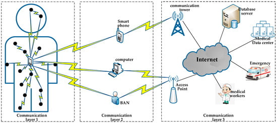 With the rapid development of the wireless communication technology and sensor technology, Wireless Body Area Network (WBAN) has been developed as a new technology. WBAN is a three-tier architecture body network [4], as shown in Figure 1. The tier-1 is composed of sensors attached to the body surface or implanted into the body. Its function is to collect and transmit various physiological information about the human body. The tier-2 is composed of smart phones, personal computers, or other intelligent electronic devices. The information sent by sensors is forwarded to the terminal data center by a wireless mode. In tier-3 of WBAN, the terminal data center is mainly composed of remote servers providing various applications. Its function is to collate and analyze the received data, to provide a dynamic response. Especially when the sensor node collects abnormal data, it will carry out emergency transmission and alarm, which can speed up the emergency processing and rescue.