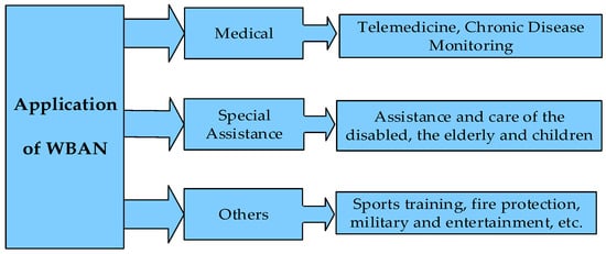 WBAN takes the human body as the application carrier, turns it into a part of the communication network, truly realizes the ubiquitous network and omnipresent service, and plays an important role in the following areas [5], as shown in Figure 2:
