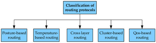 At present, the research on routing protocols for WBAN is mainly divided into the following methods [14,15], and this paper refers to the classification method presented by Bangash et al. [14], (as shown in Figure 3) posture-based routing, temperature-based routing, cross-layer routing, QoS-based routing, and cluster-based routing.