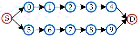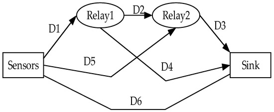 In addition to the above routing methods, some researchers have introduced the WSN multipath routing method into the routing design of WBAN, by generally, using the node-independent multipath routing method [34,35]. Multipath refers to the simultaneous establishment of multiple transmission paths, between the source node and the destination node, to transmit data in groups, in parallel. While node-independent multipath routing refers to the independent paths between the source node and the destination node, and there is no common node or path between them, as shown in Figure 14. The advantage of this method is that the multipath can be used to ensure a stable transmission, balance energy consumption of nodes, and prolong network lifetime, but there might be shortcomings when data failure in a packet might affect the accuracy of the whole data.
