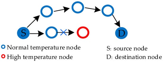 Temperature-based routing considers the temperature of nodes as the main parameter in the process of path selection. The main purpose of this routing method is to avoid the temperature rise of nodes, or quickly reduce the temperature of high-temperature nodes, by avoiding high-temperature nodes and establishing appropriate paths [20]. The routing schematic is shown in Figure 6. Temperature-based routing is the first method to be studied, because the security problem is the first one to be solved in the application of WBAN. Temperature-based routing has been widely studied during the early developmental period of WBAN, but in recent years, a large number of studies have focused on energy, so the temperature-based routing process has been slightly reduced.