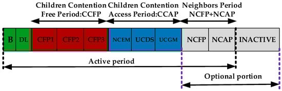 A PCLRP was proposed by Elhadj et al. [25], to design the protocol across the MAC (Medium Access Channel) layer and the network layer. This paper divides data into three categories and sets priority—P1 is emergency data (EM), referring to abnormal data; P2 is delay sensitive data (DS), referring to medical video; P3 is general data (GM), corresponding to the normal cycle data. The MAC superframe division stage is shown in Figure 9. The children competition access phase (CCAP) and children competition free phase (CCFP) are divided into three corresponding slots, according to priority, and the service is customized for different priority data. In order to ensure the priority transmission of P1 data, EM data are required to compete for access in the whole CCAP. Random back-off strategy, based on priority, is adopted in the whole competition stage, and the back-off time is determined, according to priority, so as to ensure the non-delay transmission of emergency data.
