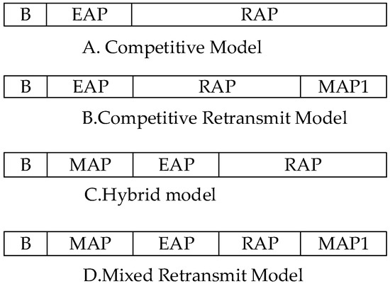 Wang and Guo [27] proposed a cross-layer retransmit protocol CLRS, based on the IEEE 802.15.6 standard, which was different from other cross-layer methods, this protocol was designed to retransmit data packets that failed to transmit. In this study, collision and shadow effects were the two main reasons for data transmission failure, and different waveforms the appeared on the output waveforms of the receiving end. The reason of the failure was judged by the characteristics of the waveforms of the data frame, and then the method of retransmitting in MAC was decided. The superframe structure is shown in Figure 10.