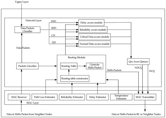 Chen et al. [26] proposed a cross-layer design optimization scheme CLDO, which optimizes network parameters, such as transmission reliability Ri, energy efficiency χ and network lifetime Tlife, through cooperation among network layer, MAC layer, and the PHY layer. The goal is to find the best transmission power, the best relay and the best packet size to solve the above problems. Before the theoretical deduction, the author carried out simulation experiments, the results showed that an appropriate transmission power and packet size can not only ensure a reliable transmission, but can also save energy consumption and prolong network life. The best relay can ensure a successful delivery of data packets and reduced errors, and energy consumption can be greatly reduced within an acceptable delay range. Therefore, based on this experiment, a large number of complex theoretical deductions have been carried out, and more convincing corresponding propositions and proofs have been given. In the routing stage, when selecting the next hop relay, the power efficiency and energy consumption rate of the node were considered comprehensively. When the residual energy of the node was lower than a certain value, the node only transmitted its own information, and readjusted the transmission power and packet size, to protect the node with low residual energy, ensure reliable transmission, and prolong the life of the whole network.