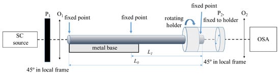 An experimental setup for measuring the sensitivity of the SHBFs to torsion is schematically shown in Figure 1. A broadband light emitted from the supercontinuum source (SC) was linearly polarized at 45° in reference to the symmetry axes of the SHBF (local frame) by the dichroic linear polarizer P1 (operation range from 0.6–1.8 μm) and coupled to the fiber through the microscopic objective O1. The input end of the SHBF of total length L0 was fixed to a stiff metal base, and its angular orientation remained constant during the measurements. The output section of the fiber of length L1, whose end was fixed together with the polarizer P2 in the rotatable holder, was subjected to twist. The distance between fixed point of the fiber and the twisted end was equal to L1 = 25 cm. The second linear polarizer P2 at the fiber output was set at 45° in reference to the symmetry axes of the fiber to obtain the maximum contrast of the interference fringes in the output spectrum. The polarizer P2 was then rotated together with the output end of the fiber; therefore, the relative orientation of the fiber symmetry axes and the polarizer P2 remained constant during the experiments. This allows using the local frame in the analysis of torsional sensitivity presented in the following paragraphs.