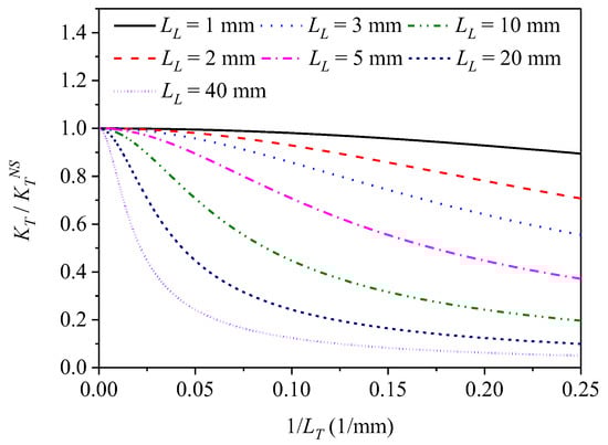Theoretical curves KT/KTNS plotted against the inverse of the fiber spin pitch 1/LT for different values of the linear beat length LL.