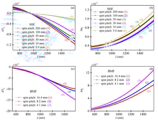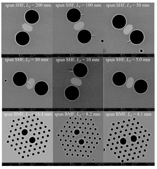 In the experiments conducted, we examined six side-hole fibers (SHFs) with spin pitches equal to LT = 200, 100, 50, 30, 10 and 5 mm and three birefringent microstructured fibers (BMFs) with spin pitches equal to LT = 16.4, 8.2 and 4.1 mm. The cross-sections of all investigated fibers are shown in Figure 4. Using the spectral interferometry method combined with the lateral point-force method [], we measured the spectral dependence of the phase linear birefringence Δnl and the elliptical group birefringence ΔNe in the investigated fibers (Figure 5). The fibers with different spin pitches were drawn from the same preform rotating with different angular velocities. The measured spectral dependences of Δnl varied with the fiber spin pitch, which suggests that the fiber geometry is affected by preform spinning during the drawing process. Our results presented in Figure 5 show that the microstructured fibers having more complex cross-section geometry are particularly susceptible to this effect.