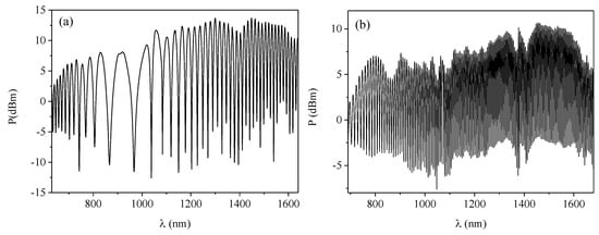 Transmission spectra registered for the side-hole fiber of length L0 = 10 m and spin pitch LT = 5.0 mm (a) and for the birefringent microstructured fiber of length L0 = 0.35 m and spin pitch LT = 8.2 mm (b).