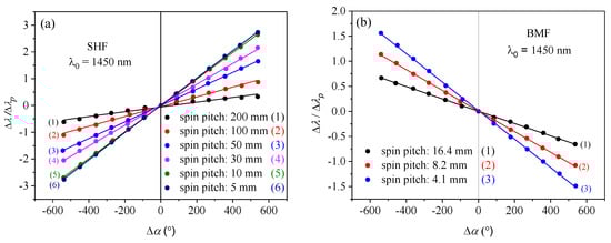 The investigated fibers were subjected to additional twist in the range from −540° (anticlockwise) to +540° (clockwise). According to the analytical results presented in the previous section, the additional twist of the spun highly birefringent fiber caused displacement of the spectral interference fringes in the direction determined by the handedness of the initial fiber twist. In Figure 7, we show the twist-induced displacement of the spectral fringes registered for the SHF of a total length L0 = 10 m (L1 = 0.25 m) and spin pitch LT = 30 mm. In Figure 8a, the spectral shift is shown for all the examined SHFs measured at the wavelength 1450 nm, while the results obtained for the BMFs are displayed in Figure 8b. The measured wavelength shifts were normalized to the width of the interrogated interference fringe Δλp. By linear fitting of the experimental data, we then determined the normalized sensitivity to torsion Kα for each of the investigated fibers. The obtained results clearly show that Kα increased with the decaying value of the spin pitch LT. This agrees well with the derived formula for the normalized sensitivity to torsion given by Equation (13). Different signs of the normalized sensitivity Kα for the side-hole fibers and the microstructured fibers was caused by opposite preform spinning directions during the drawing process. The side-hole fibers were spun anticlockwise, and therefore, additional torsion in the clockwise direction resulted in the decrease of the total twist angle α. In contrast, the total twist angle of the birefringent microstructured fibers increased when the fiber was subjected to additional clockwise torsion.