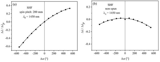 Additionally, we have measured the response to twist in the non-spun side-hole fiber, which is shown in Figure 9b. According to the analytical results, the response of the non-spun fiber to twist was nonlinear with zero sensitivity at Δα = 0°. Moreover, it is characteristic for a non-spun fiber that the sign of wavelength shift is always negative regardless of the direction of twist Δα.
