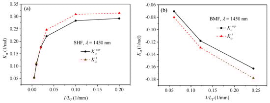 The experimental values of the normalized sensitivity to torsion Kαexp together with linear fitting errors are presented in Table 1 for the SHFs and in Table 2 for the BMFs. The sensitivities Kαexp were determined at two wavelengths λ1 = 1210 nm and λ2 = 1450 nm. The response of the weakly spun side-hole fiber presented in Figure 9a was linearly fitted in the small twist range from −180°to +180° where the nonlinear component is negligible. Our experimental results show that the normalized sensitivities measured at two wavelengths were not the same (sensitivity decreased against wavelength), and the average difference reached 5% for the side-hole fibers and 19% for the birefringent microstructured fibers. It is not surprising that the sensitivity was found to be more dispersive for the microstructured fibers, as the birefringence dispersion in these fibers was greater than in the side-hole fibers (Figure 5).