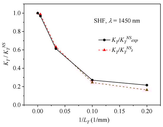 where L1 indicates the length of the fiber section exposed to temperature variation and is the normalized temperature sensitivity of non-spun fiber with linear birefringence Δnl. The above relation shows that the sensitivity to temperature is the highest for non-spun fiber and asymptotically tends to zero for increasing fiber twist rate. In Figure 3, the ratio is shown as a function of the inverse of the fiber spin pitch 1/LT. We therefore conclude that application of spun highly birefringent fibers with short spin pitches to twist measurement are particularly beneficial, as the high twist rate increases the normalized sensitivity to torsion and simultaneously decreases the normalized sensitivity to temperature, thus reducing the cross-sensitivity effect.