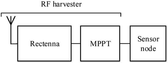 Figure 1 shows the block diagram of an RF harvester powering a sensor node. The rectenna (rectifying antenna) transforms the RF signal to a DC voltage and the maximum power point tracker (MPPT) provides the optimum load to the rectenna to transfer the maximum power to the sensor node.
