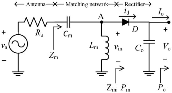 Figure 2 shows the schematic circuit of the rectenna under study [33], which includes a high-pass L-matching network (composed of a capacitor Cm and an inductor Lm), a half-wave rectifier, and an output filtering capacitor (Co). The antenna is modelled by a sinusoidal voltage source va of amplitude Vap and frequency fo with a series radiation resistance Ra. On the other hand, vin, Zin, and Pin are, respectively, the sinusoidal voltage, impedance, and power at the input of the rectifier, id is the diode current, and Vo, Io, and Po are, respectively, the DC voltage, current, and power at the rectenna output. An equivalent resistance Ro is defined as Vo/Io.